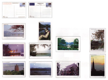 该套明信片分为A、B两组,每组10枚。A组为国内邮资,面值15分;B组为国际航空邮资,面值160分。